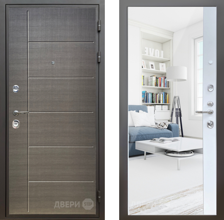 Входная Дверь Шелтер (SHELTER) Комфорт Лен сильвер 14 с зеркалом Белый матовый 960x2050 мм